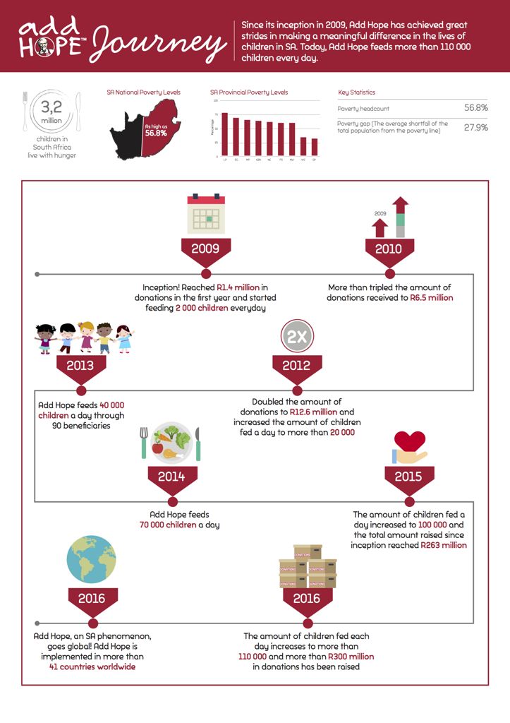 KFC’s CSI programme, Add Hope has been around since 2009 and today feeds more than 110 000 children every day through its 110 beneficiaries. These include childhood development organisations, children’s homes and school feeding programmes. The initiative partners with these beneficiaries to ensure that children are receiving a nutritious meal daily. Add Hope, which runs all year round, allows you to make a difference in the lives of children’s by simply contributing R2 towards the the foundation when you visit a KFC restaurant. In South Africa, 26% of children under the age of nine are stunted as they do not receive sufficient nutrition for proper brain and physical development. This means they cannot learn and play as other children would. KFC’s corporate social responsibility programme, Add Hope, hopes to change this by making a difference in the lives of children in South Africa, providing them with nutritional meals to help them learn, grow and thrive. Since its launch in 2009, Add Hope has grown to feed over 110 000 children across South Africa every day. Running all year round, Add Hope is a national feeding initiative, allowing KFC customers to purchase ‘hope’ off the menu for just R2. This way every one of us has the power to change someone’s life, with every donation going directly to one of 110 Add Hope beneficiaries. For more information, please visit www.addhope.co.za